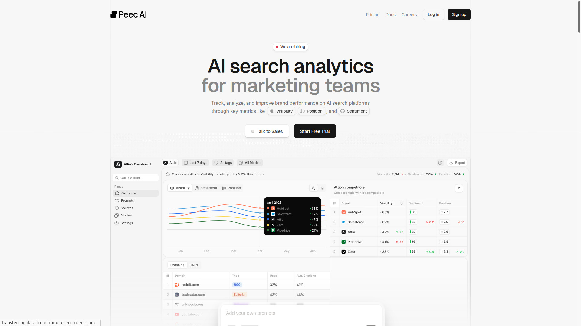 Peec.ai is an AI search analytics tool specifically for marketing teams, focusing on how brands are referenced in AI-powered search across platforms like ChatGPT, Perplexity, Claude, Gemini, and Google AI Overviews. It conducts daily prompts to track brand mentions and citations, providing a clear visibility score over time.