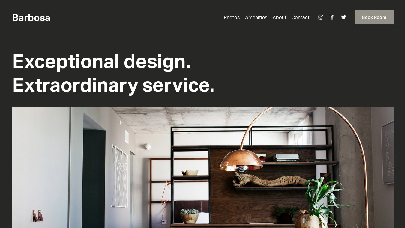 The Squarespace template Barbosa incorporates a clean and minimalistic design. The Photos, Amenities and About sections are kept simple with large images and some text. The contact section includes a map and some contact information. As per default the template comes along with a grey background, which easily could be changed into any other color or white. The Squarespace template Barbosa is most suitable for small hotels and guesthouses but could also be used for companies working in the Real Estate & Properties segment.